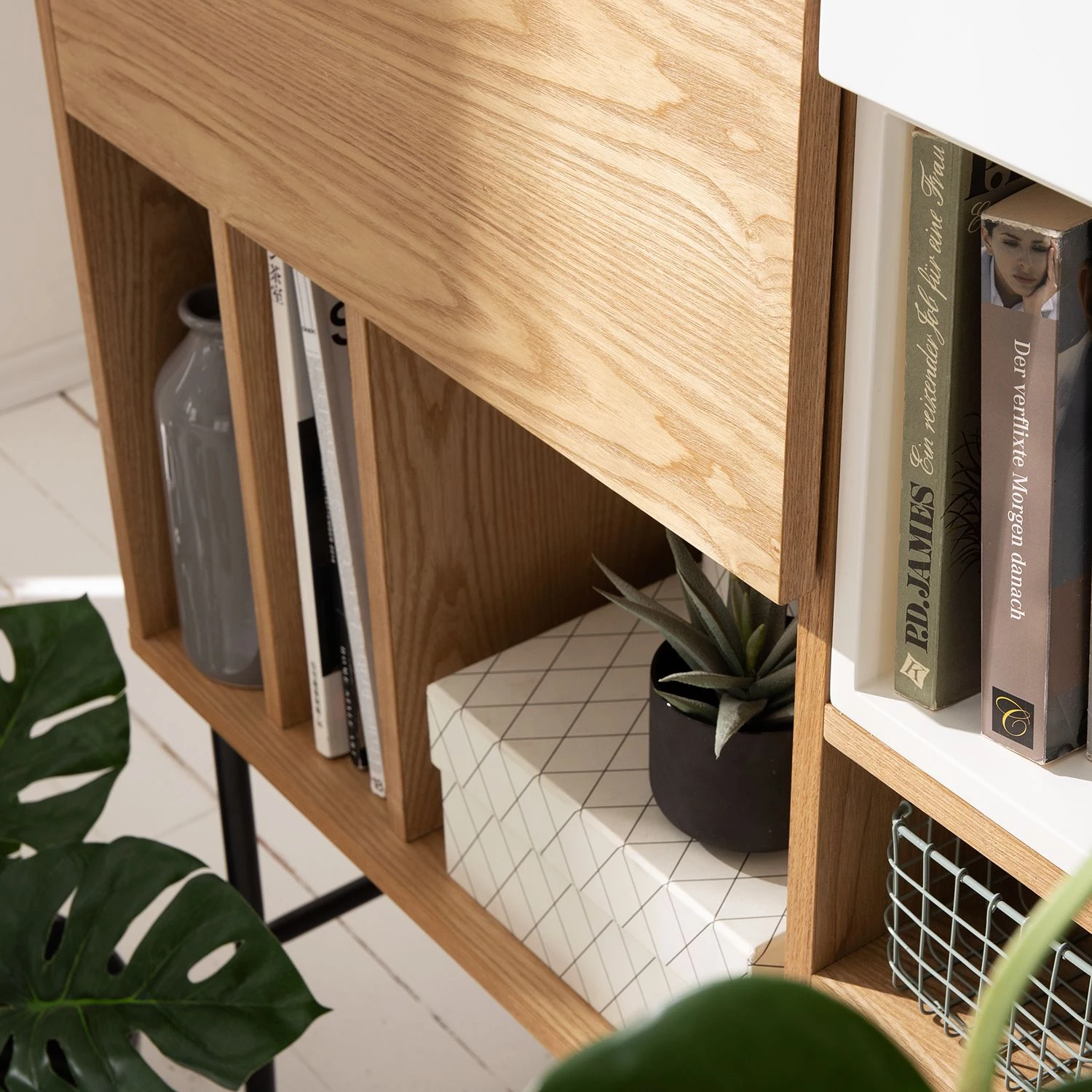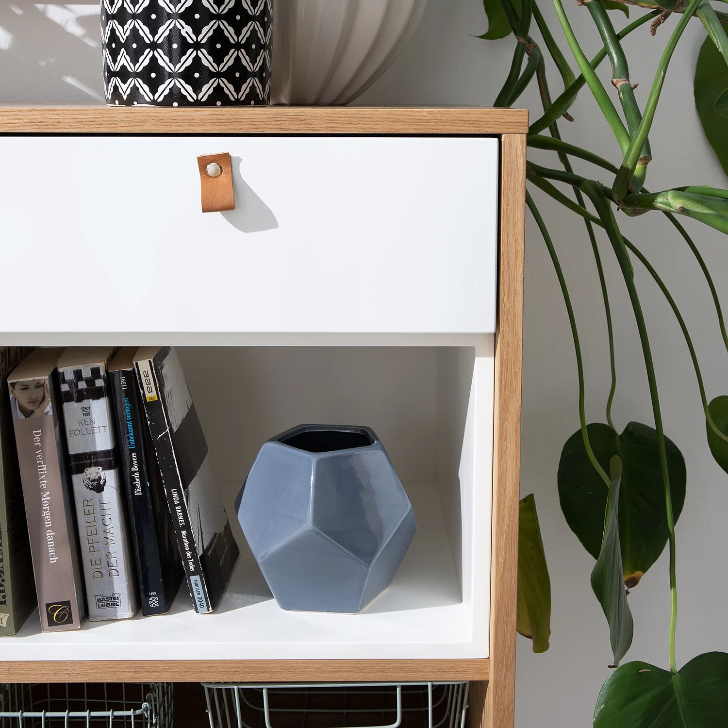 - Façade des tiroirs et éléments décoratifs : blanc mat